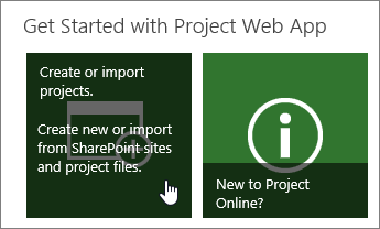 The easiest way to create a new project in Project Web App is to click Create or import projects, under Get Started with Project Web App on the main Project Web App home page.