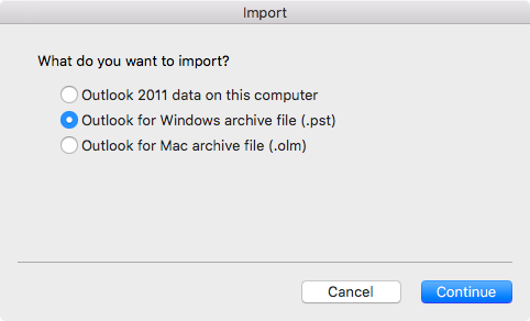 A .pst file is the data file used by Outlook for Windows to archive your email messages, contacts, calendar items, tasks, and notes. Import the .pst file in order to transfer messages from a Windows-based computer to Outlook for Mac.