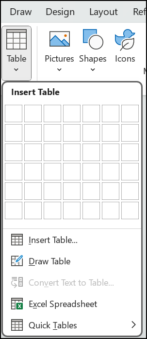 Select Insert > Table and then select the table size you want.