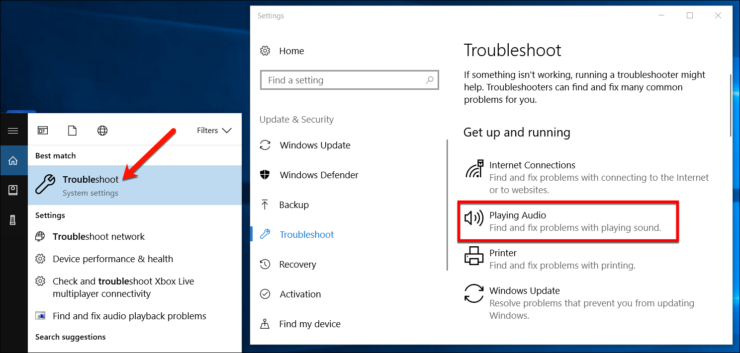 For help with fixing audio or sound problems, try the audio troubleshooter, which can often fix audio problems automatically. To run the troubleshooter, click the Start button, type Troubleshoot, and then click Troubleshoot in the listing. Click Playing Audio > Run the troubleshooter.