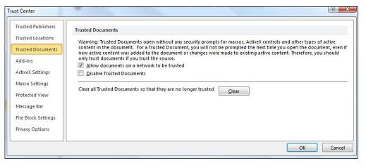 You can view or change Trusted Documents settings in the Trust Center. Making changes starts or disables the ability to create trust documents that protects your computer and your organization's network from possible malicious code in active content.