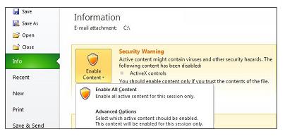 For these files, click Enable All Content to enable the active content for that session. This enables the content for one time, only. The Message Bar appears when you reopen the file.
