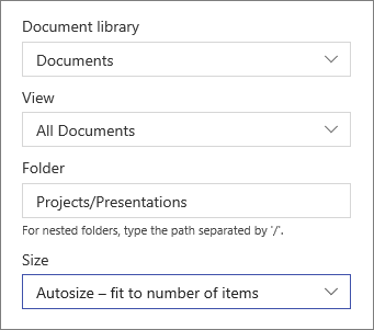 )Â on the top left side to change the Document library, the View of your library, and the size. You can also display a specific folder in the library by entering the folder name (use a "/" to separate the names of nested folders - in the example below, Projects is a folder in the Documents library, and Presentations is the nested folder): -