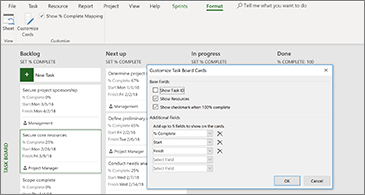 Important:Â The column headers in the Task Board view are the same as the column headers for the agile tools in Project. So if you are using both agile and Task Board view, whatever changes you make to the column headers will show up in both views.